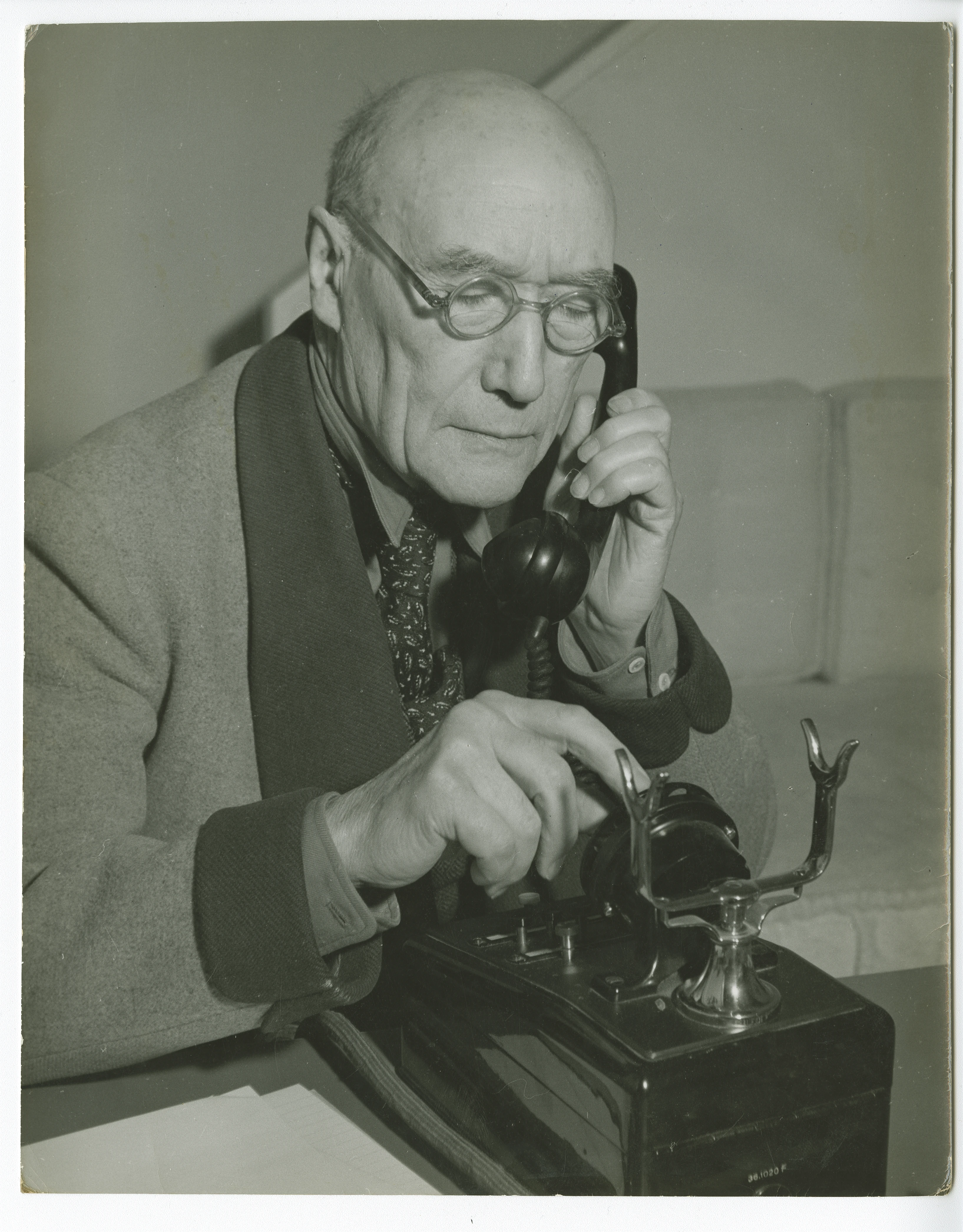 portrait photographique d’André Gide, avec lunettes, en train de téléphoner, chez Richard Heyd, hiver 1947
