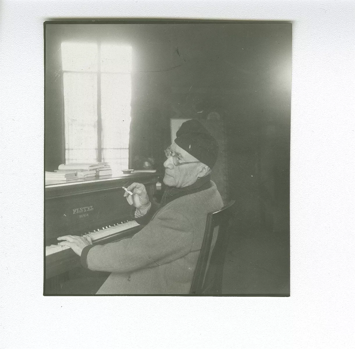 portrait photographique d’André Gide, avec lunettes et bonnet, de dos, au piano, fumant, au Vaneau