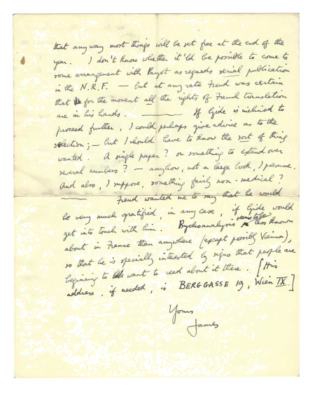 La lettre évoque une rencontre entre le signataire et Sigmund Freud. À la demande de Gide, ledit « James » signale les projets de publication des textes de Freud en France, à cette époque, notamment chez Payot. Il ressort que Freud serait très content de rentrer en relation avec Gide, lui même apparemment intéressé à voir le psychanalyste publié à la NRF et lui demande de lui écrire directement à la Berggasse 19 à Vienne