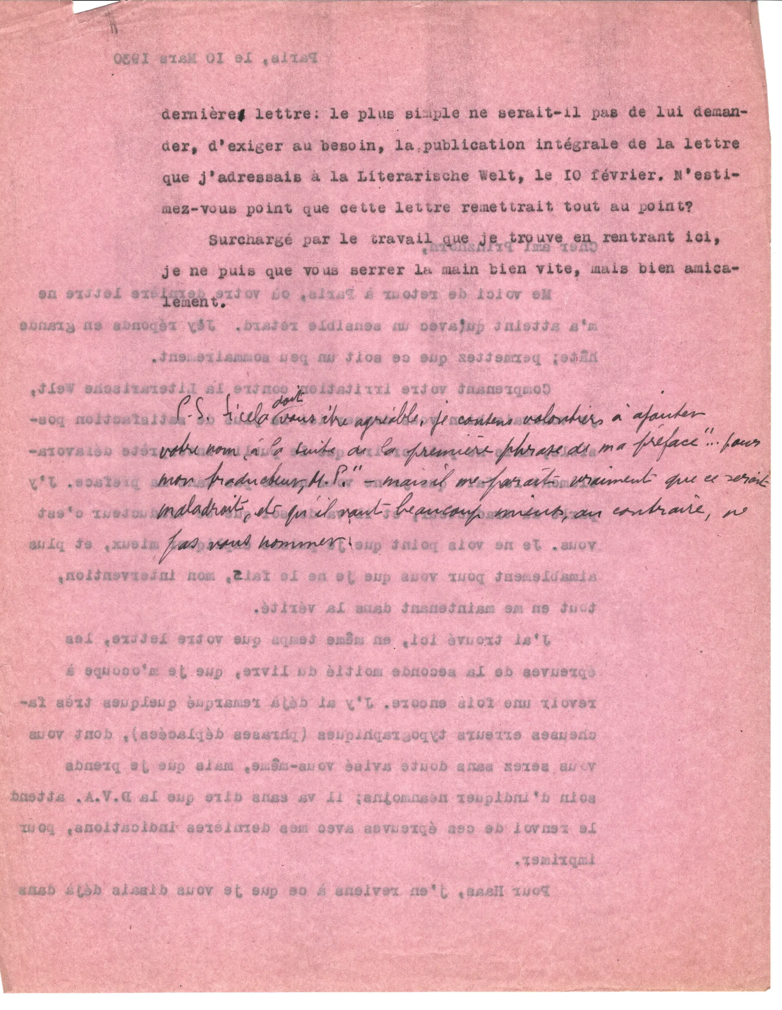 Lettre d’André Gide à Hans Prinzhorn, du 10 mars 1930, 1 feuillet dactylographié sans signature autographe [en deux exemplaires]
