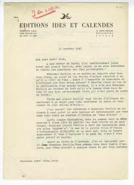Lettre à André Gide, du 11 octobre 1945, envoyée de Neuchâtel, Suisse, sur papier à en-tête de la maison, évoquant l’édition de Jeunesse, 3 feuillets dactylographiés avec signature autographe de Richard Heyd