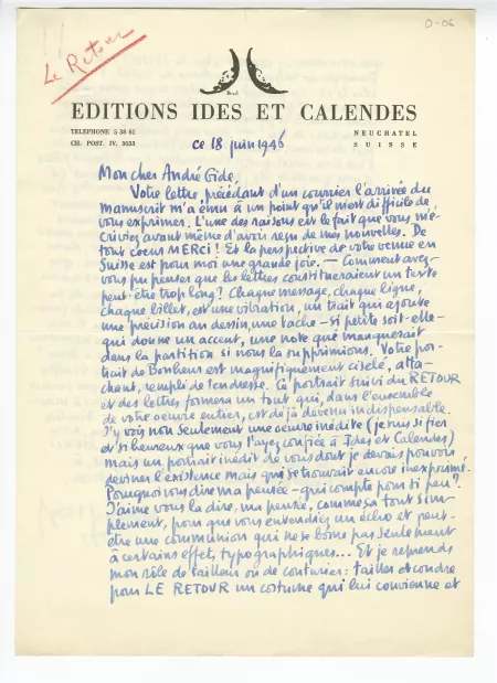 Lettre à André Gide, du 18 juin 1946, envoyée de Neuchâtel, Suisse, sur papier à en-tête de la maison, 1 feuillet ms. R/V.