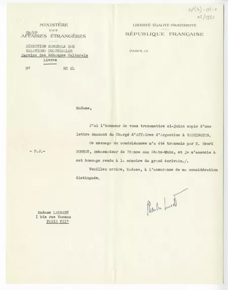 Lettre de condoléances à Catherine Gide après le décès d’André Gide, du 21 février 1951, envoyée de Brattleboro, Vermont, États-Unis d’Amérique, 1 feuillet ms. avec enveloppe d’envoi affranchie.