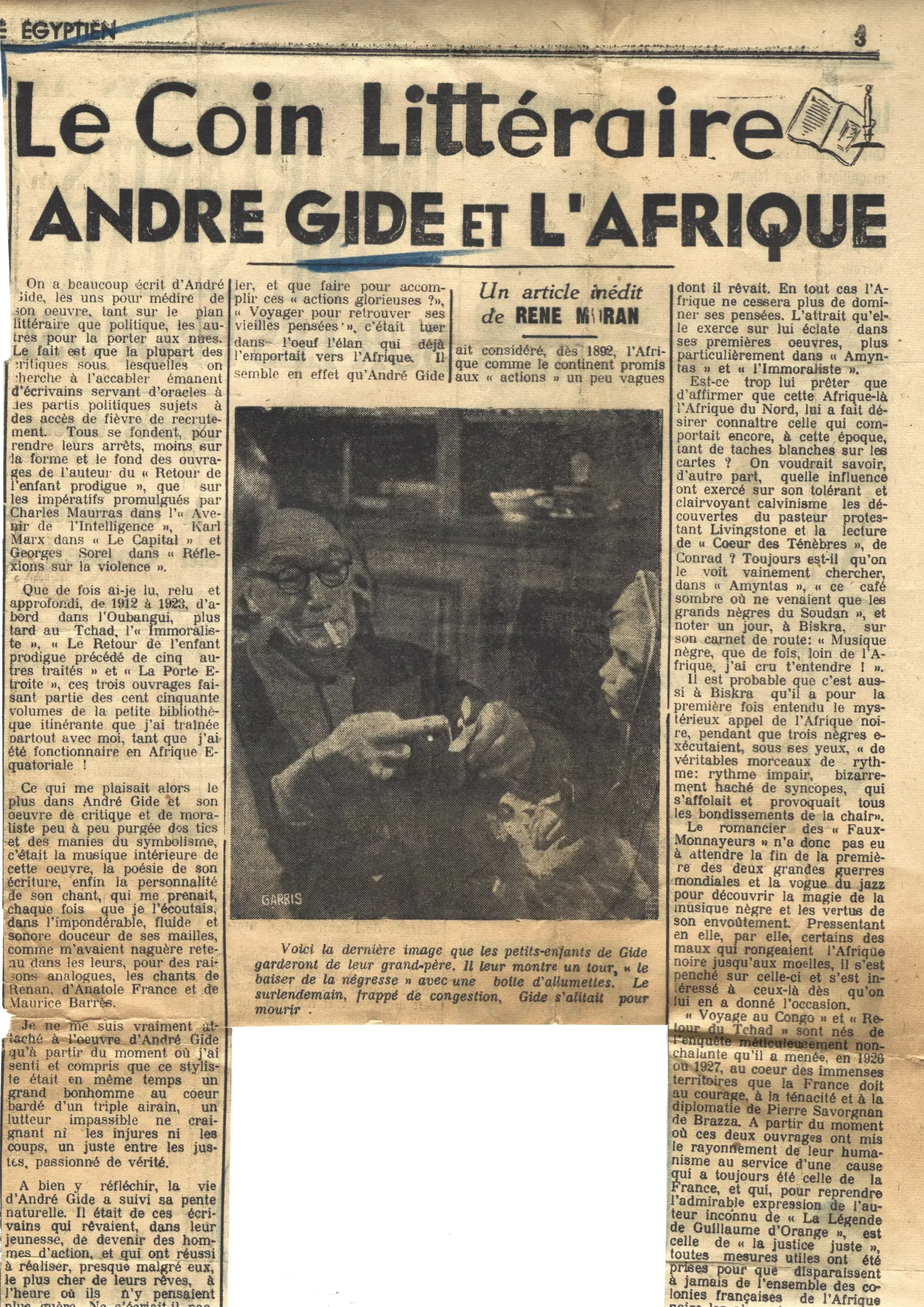 Article intitulé « André Gide et l’Afrique », paru le 22 avril 1951, de René Maran, 1 coupure de presse, 4 colonnes avec photographie