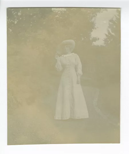 portrait photographique en pied de Maria Van Rysselberghe, au chapeau