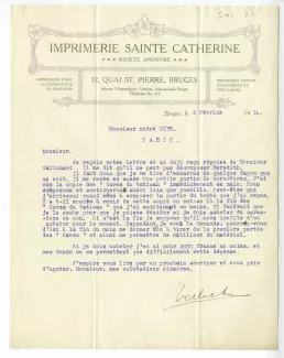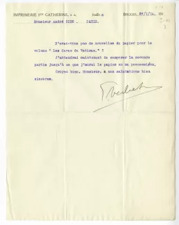 Lettre à André Gide, du 7 avril 1914, sur papier à en-tête « Imprimerie Sainte-Catherine », envoyée de Bruges, Belgique, 1 feuillet dactylographié avec signature autographe