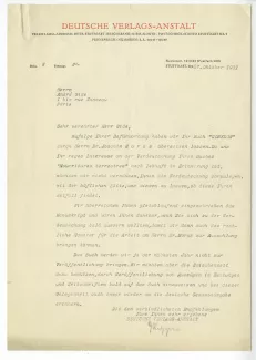 Lettre [copie] de Deutsche Verlags-Anstalt, du 9 octobre 1931, écrite en allemand, envoyée de Stuttgart [sur papier libre], 1 feuillet dactylographié R/V sans signature autographe