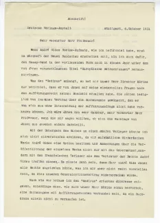 Lettre à André Gide., du 27 octobre 1931, écrite en allemand, envoyée de Stuttgart, sur papier à en-tête de la maison, 1 feuillet dactylographié avec signature autographe