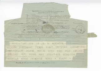 Télégramme de la Gazette littéraire de Moscou sur l'œuvre de Maxime Gorki, 13/09/1932 – 1 feuillet imprimé