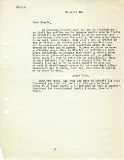 Lettre d’André Gide à Claude Vigée, du 5 juillet [19]48, 1 feuillet dactylographié sans signature autographe