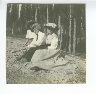 photographie où l'on reconnaît Maria Van Rysselberghe, deuxième à gauche, Marie Closset [?] assise à ses pieds, Marie-Thérèse Muller, première assise à droite, avec le chien Nick, en promenade, à Saint-Clair